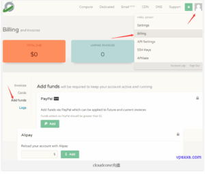 点击右上角的头像,选择Billing,然后再选择Add funds,这里就可以充值了,可以看到支持paypal和alipay(支付宝),在输入框那里填写要充值的金额,然后点击后面绿色的Add就会跳转到充值页面了
